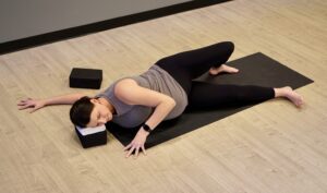 As for seated twists you can follow the same guidelines above by finding an open twist (twisting the opposite direction, away from your bent leg). Focus on length rather than depth – not the time to wring out! If you are ok being on your back for a few moments, supine twist can be an excellent gentle twist. Use a block under your top leg and behind your back as a wedge. This creates a little more stability and support.