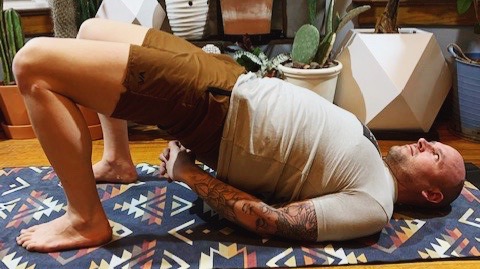 How to do it: Lay on your back. Bring the soles of your feet onto the earth so that your knees are directly over your ankles. Inhale, lift your hips away from your mat. Maintain space between your chin and your chest, so imagine lifting your gaze straight upward and slightly back behind you.