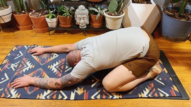 How to do it: Bring your big toes together to touch behind you. Sink your hips back toward your heels (you can use blocks, blankets or even a pillow beneath your seat if this is at all uncomfortable). Allow your belly to rest on your thighs and stretch your arms out in front of you. Rest your forehead on your mat and take 10, slow, steady breaths.
